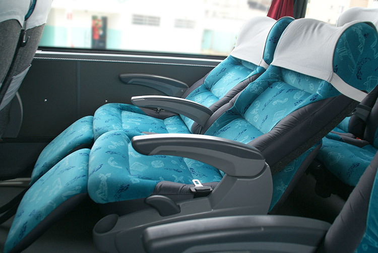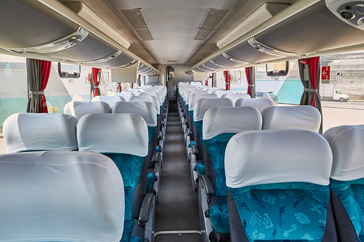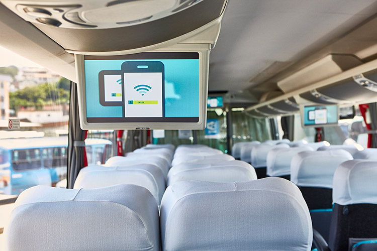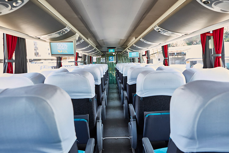 Moderno ônibus Semi Leito com banheiro, wi-fi, tv e vídeo, geladeira, cafeteira e ar-condicionado.